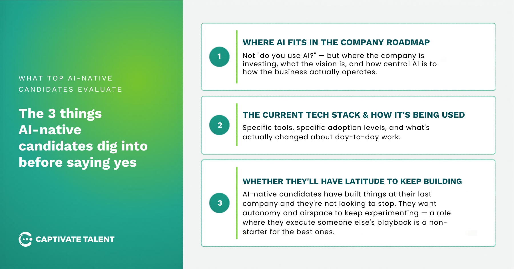 From our placement data, the best AI-native candidates are asking about three things when they evaluate a role: